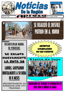 TAPA Y PRIMERA PARTE diario1-2-11-12 bis 627 SEGUNDA PARTE diario 3-4-9-10 Bis 627 TERCERA PARTE Pagina5-6-7-8 Bis 627 Navegación de entradas Edición Impresa Noticias de la Región N° 626 – 8 de Agosto de 2022 Edición Impresa Noticias de la Región N° 628 – 24 de Agosto de 2022